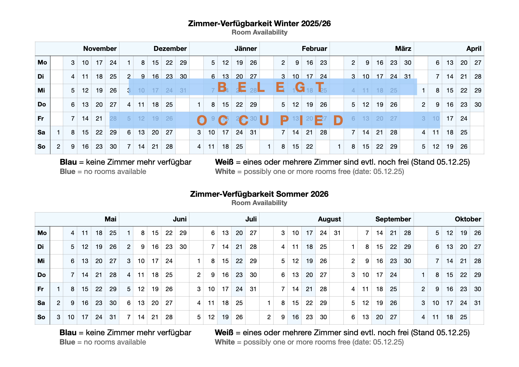 In der Zwischensaison, vor dem 25.12. und nach dem 31.03., haben wir leider geschlossen.